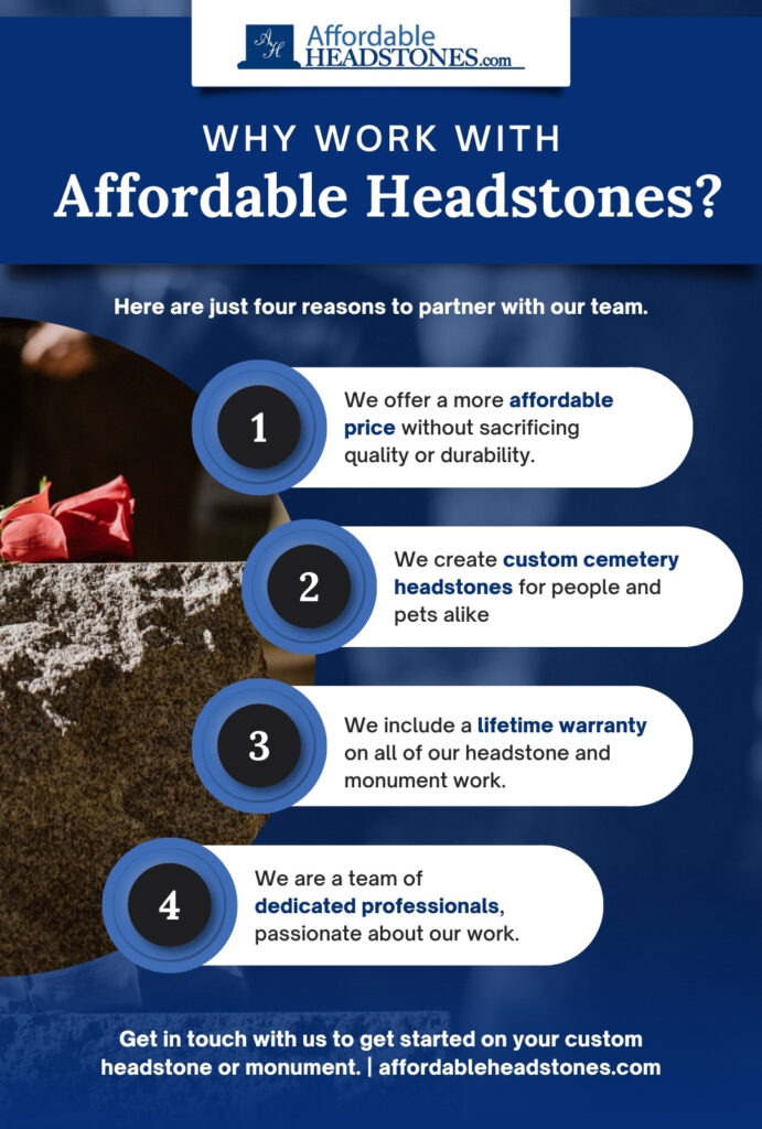 When it comes time to bury a loved one, the last thing you want to worry about is the cost of the headstone. At Affordable Headstones, we understand this, which is why we offer reasonably priced, custom headstones for people and pets. Here are four benefits of choosing us for your custom cemetery headstone, monument, and other custom memorial needs.